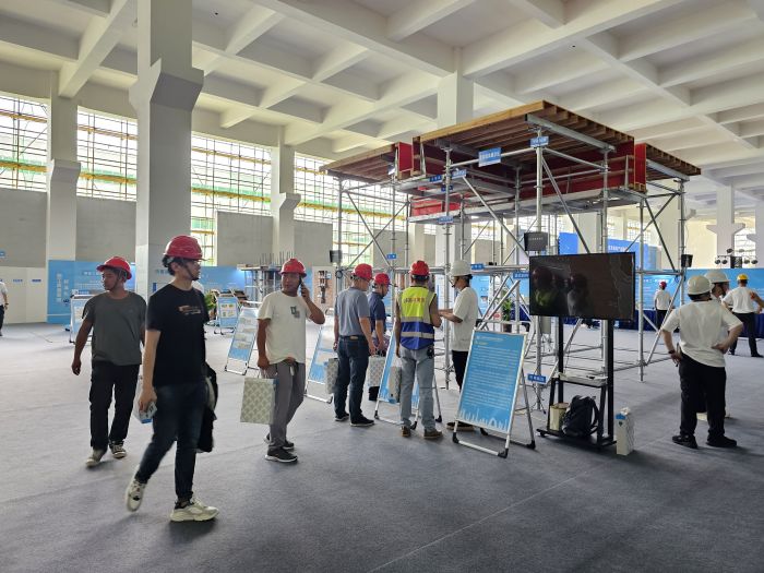 在盤扣架體展示區(qū),由五恒模架承建的M60盤扣一體化施工部分被作為項目施工的重要亮點進行了展示和觀摩,公司蕪湖京東項目技術負責人從“項目概況、設計依據、施工工藝”等方面對項目承插型盤扣式鋼管腳手架搭設做了詳細講解,并配合實體和現(xiàn)場觀摩,展示了公司承插型盤扣式腳手架支撐系統(tǒng)安全、穩(wěn)固、節(jié)省工期、形象美觀等優(yōu)點。
